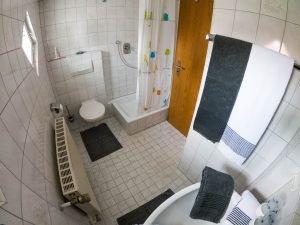 - ein helles Bad mit Dusche/Duschvorhang/WC und Waschbecken.